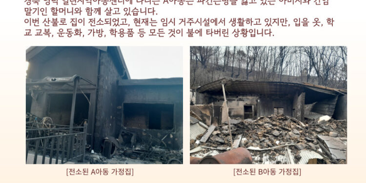 전국적인 산불 피해로 인하여 많은 국민들이 피해를 보고 있는 가운데 지역아동센터 아이들의 소중한 집이 사라져서 사단법인 전국지역아동센터협의회(남세도 이사장)에서는 산불 피해 지역아동센터 아동지원 긴급모금을 실시하고 있다.