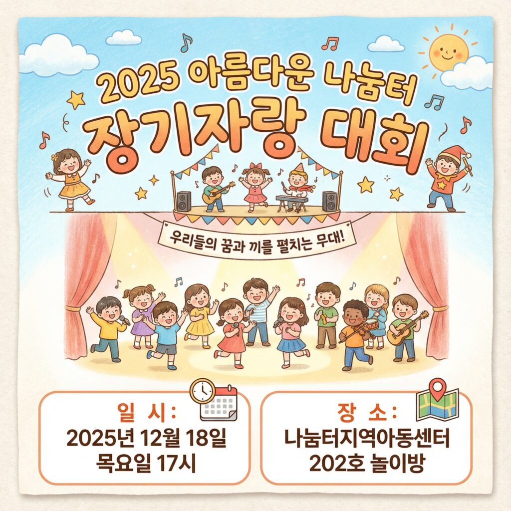 나눔터지역아동센터(시설장 문영숙)는 오는 12월 18일(목) 오후 5시(17시), 센터 202호 놀이방에서 **‘2025년 제4회 아름다운 나눔터 장기자랑대회’**를 개최한다고 밝혔다.