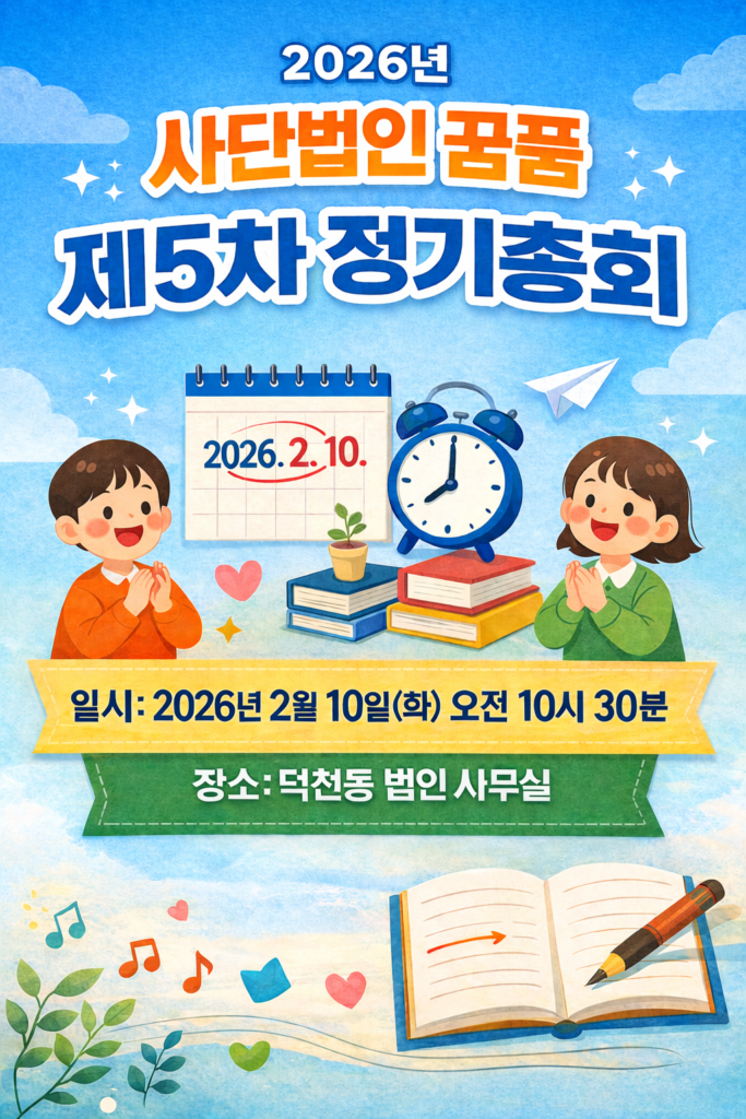 사단법인 꿈품(이사장 문동현)은 2026년 2월 10일(화) 오전 10시 30분, 덕천동 법인 사무실에서 2026년도 제5차 정기총회를 개최할 예정이라고 밝혔다. 이번 정기총회에는 문동현 이사장을 비롯해 사단법인 꿈품 소속 산하기관인 1318미래세대, 나눔터, 라온, 몰운대, 미래, 온누리, 더사랑, 승학, 꿈터, 엘림 등 총 10개 지역아동센터의 시설장과 종사자(복지사), 회원들이 참석할 예정이다. 정기총회에서는 2025년도 각 센터별 사업보고 및 결산보고 승인, 2026년도 […]