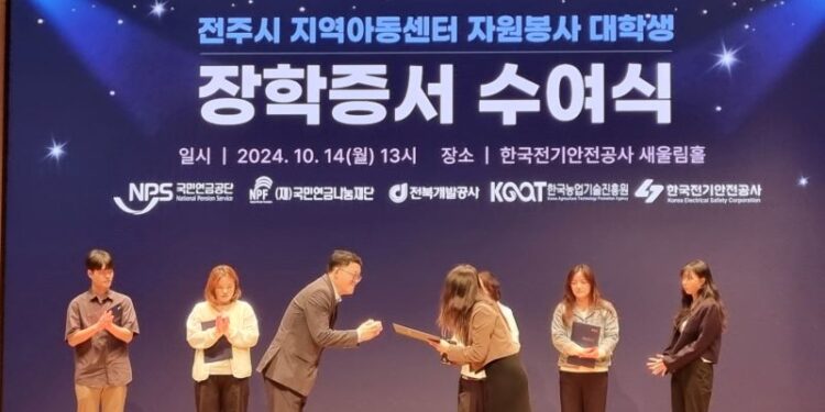 2024. 10. 14.(월), 13:00~14:00 ESG협의체(국민연금공단, 한국전기안전공사, 전북개발공사, 한국농업기술진흥원)와 전주시지역아동센터연합회는 한국전기안전공사 1층 새울림홀에서 장학금 및 장학증서 전달식을 개최했다.