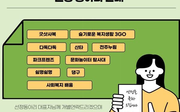 이번에 선정된 동아리는 ▲굿샷사북 ▲슬기로운 복지생활 3GO ▲다독 다독 ▲산타 ▲전주누림 ▲파크 프렌즈 ▲문화놀이터 탐사대 ▲쉼멍 쉼멍 ▲댕구 ▲사회복지 배움 등이다.