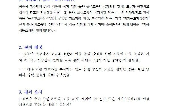 그러나 지아센 뉴스는 이번 정책 추진 과정에서 지역사회에서 오랜 기간 축적된 돌봄과 교육의 전문성을 지닌 ‘지역아동센터’와의 연계가 필수적임을 강조하며 다음과 같은 정책 질의서를 공개한다.