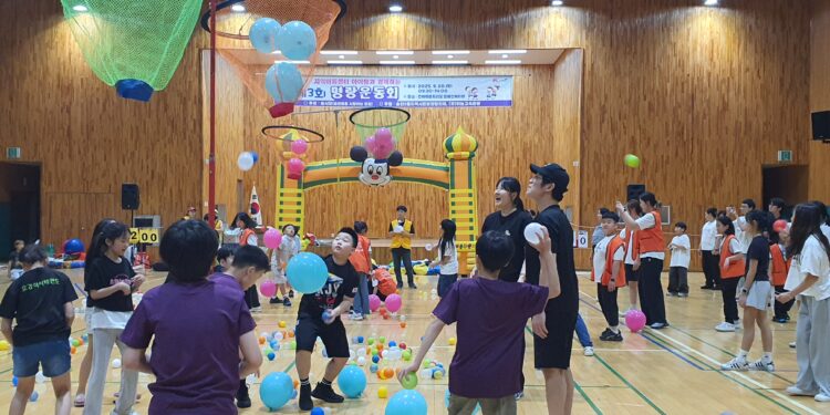 가을을 앞당기는 비가 촉촉이 내린 온가을달 열아흐레(9.19), 전북자치도장애인복지관 대강당에서 전주 송천동에 있는 8개 지역아동센터(따숨,바다별,솔내,솔빛,송천나눔,시영,전미,전심) 170 여 명의 아이들이 모여 ‘명랑운동회’를 열었다. 이 행사는 송천동을 사랑하는 모임(이하 송사모, 이재옥 회장)과 송천2동 지역사회보장협의체(동장 최용신)가 함께 해 온 활동으로 2023년 전주 미산초 운동장에서 처음 시작되어 올 해 3회를 맞고 있다.