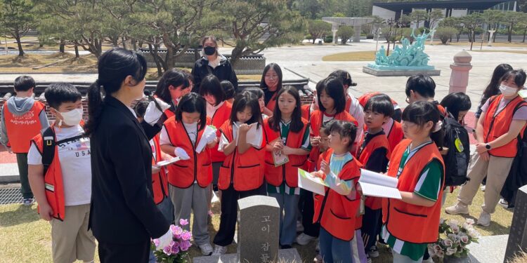 ▲518 민주화묘역에서 해설사 설명을 들으며 기록하고 있는 어린이들