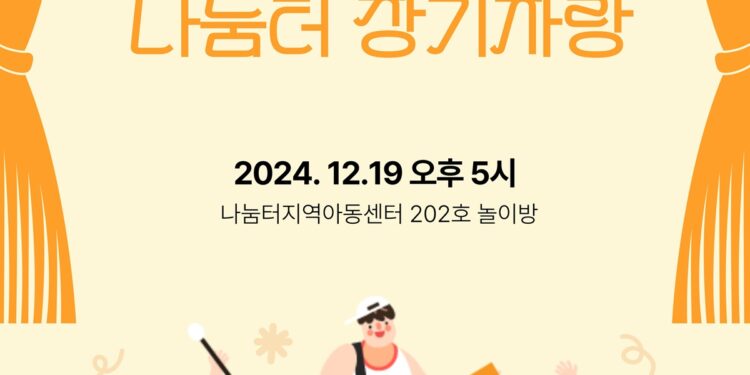 아름다운 나눔터 장기자랑이 오는 12월19일 오후 5시 202호 놀이방에서 진행됩니다.