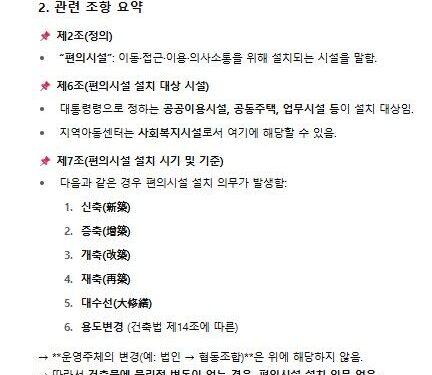 지역아동센터에 따르면, 운영 주체의 변경만으로는 『장애인·노인·임산부 등의 편의증진 보장에 관한 법률』에 따른 편의 시설 설치 의무가 발생하지 않는 것으로 확인되었다. 즉, 건축물에 구조적 변경(신축, 증축, 대수선, 용도변경 등)이 없는 경우, 협동조합이나 법인으로의 전환 자체는 편의시설 설치 대상이 아니다.