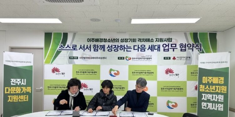 사) 아시아이주여성센터(대표 이금남)는 이주 배경의 다문화가족을 포함한 모든 가족 구성원의 행복한 삶과 복지향상을 위해 노력하고 세계인의 평화를 도모함을 목적으로 운영하는비영리법인으로서 2024 이주배경청소년의 성장기회 격차해소 지원사업인 “스스로 서서 함께 성장하는 다음세대 “사업을 진행하게 됨으로서 3자간 업무협약식을 가지게 되었고, 전주시의 다문화아동에게 학업지원, 진로지원, 역량강화등 다양한 지원과 다문화 아동발굴, 다문화 인식개선등 3자간 적극적인 협조로서 긍정적인 효과가 나타날 것으로 예상된다.