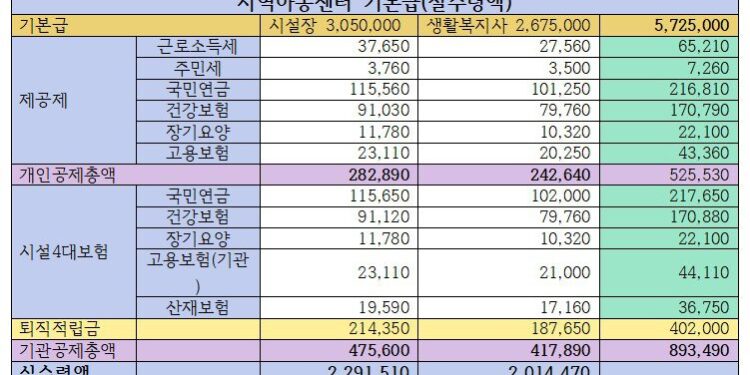 대표 및 시설장의 퇴직금 및 내년도 국민연금 요율이 확정되지 않아 보험료가 약간씩 차이가 있지만, 지역아동센터 선생님들이 받는 인건비는 보면 일하고자 하는 의욕을 사라지게 한다.