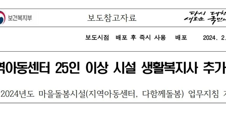 2024년 2월 20일 보건복지부 인구정책총괄 마을돌봄TF부서에서 ‘지역아동센터 25인 이상 시설 생활복지사 추가 배치’ 보도자료를 발표하였다.