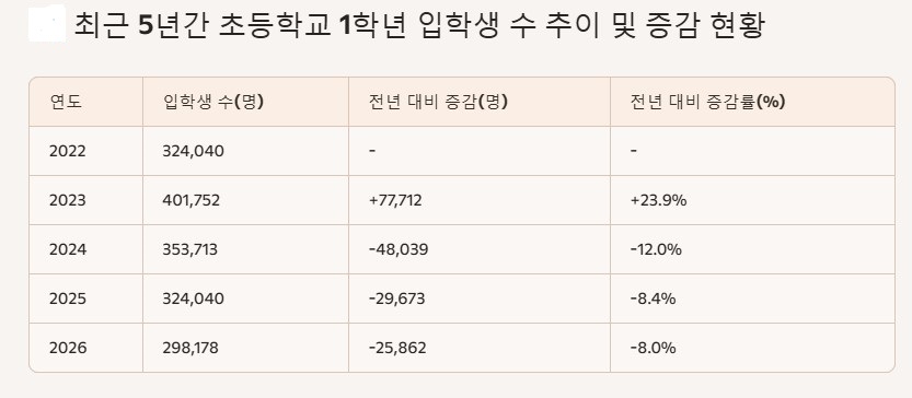 최근 5년간 초등학교 신입생 수를 살펴보면 감소세가 뚜렷하다. 2022년 32만4040명이던 초등학교 1학년 학생 수는 2023년 40만1752명으로 잠시 반등했으나, 이후 다시 급격히 줄어들며 2024년 35만3713명, 2025년 32만4040명, 그리고 올해 29만8178명으로 감소했다. 불과 5년 사이에 10만 명 이상 줄어든 셈이다.
