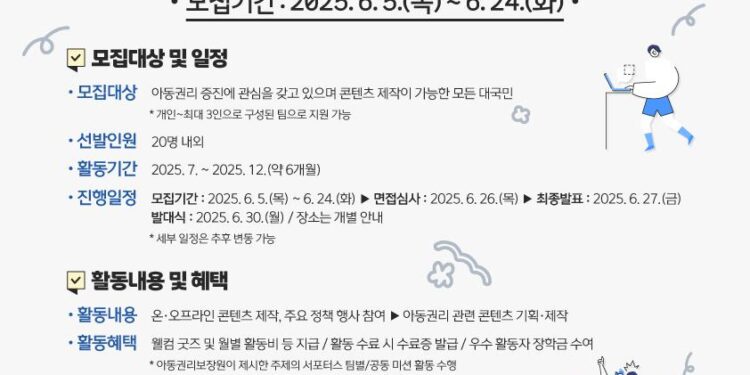 이번 서포터스는 아동권리에 관심 있는 국민 누구나 지원할 수 있으며, 개인 또는 최대 3인으로 구성된 팀 단위로도 참여가 가능하다. 선발 인원은 총 20명 내외이며, 약 6개월간의 활동을 통해 온라인 콘텐츠 제작, 정책 캠페인 참여, 주요 행사 취재 및 콘텐츠 기획 등 다양한 활동을 수행하게 된다.