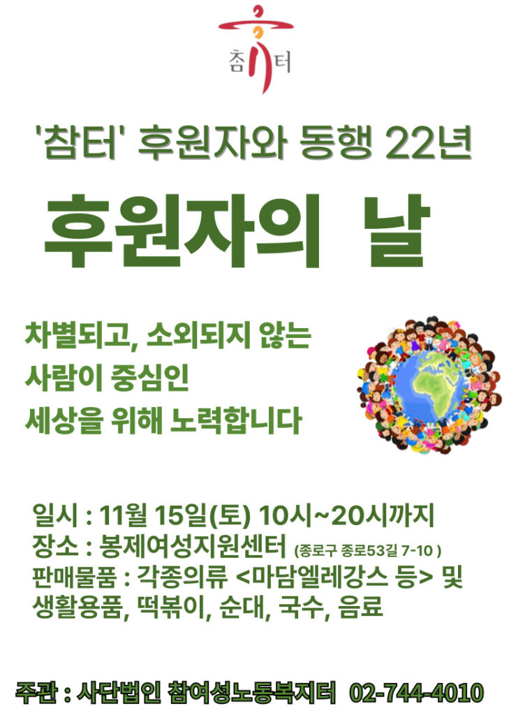 사단법인 참여성노동복지터가 11월 15일, 서울 종로구 봉제여성지원센터에서 ‘후원자의 날’ 행사를 개최한다. 이번 행사는 참여성노동복지터가 후원자들과 함께 걸어온 22년의 여정을 기념하고, 차별과 소외 없는 사람 중심의 세상을 향한 비전을 공유하는 자리이다.