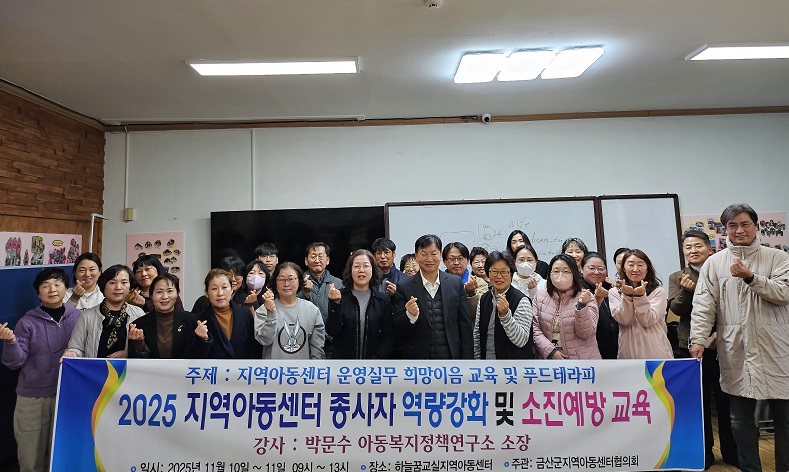 지난 11월 10일부터 11일까지 이틀간, 금산군 하늘꿈교실지역아동센터에서는 지역아동센터 종사자들을 위한 특별한 교육 프로그램이 진행됐다. ‘2025 지역아동센터 종사자 역량강화 및 소진예방 교육’이라는 주제로 열린 이번 행사는 금산군지역아동센터협의회가 주관하고, 아동복지정책연구소 박문수 소장이 강사로 나서 실무 중심의 강의를 펼쳤다.
