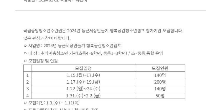 국립중앙청소년수련원은 디지털 사격과 실내 암벽, 공동체 활동을 결합한 ‘둥근세상 만들기(모두의 놀이터)’ 프로그램을 운영하며, 국립평창청소년수련원은 모험과 문화예술을 접목한 ‘늘빛나리 캠프’를 통해 청소년들에게 새로운 도전을 제공한다. 전남 고흥의 국립청소년우주센터에서는 망원경 관측과 우주인 훈련 장비 체험이 포함된 ‘별별톡톡 가족 우주과학 캠프’가 진행되고, 전북 김제의 국립청소년바이오생명센터에서는 DNA 추출과 생명과학 실험을 체험할 수 있는 ‘겨울방학 생명과학 캠프’가 열린다.